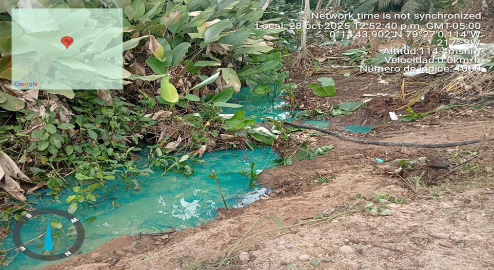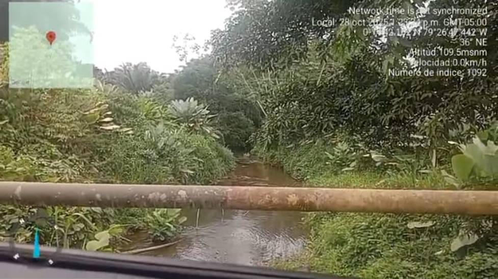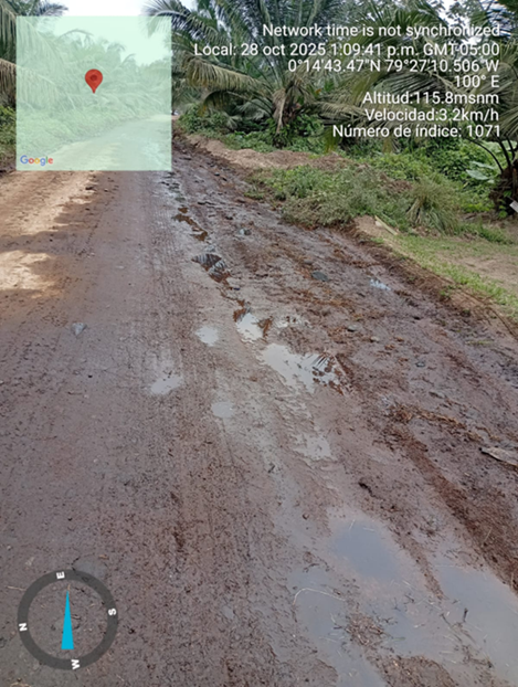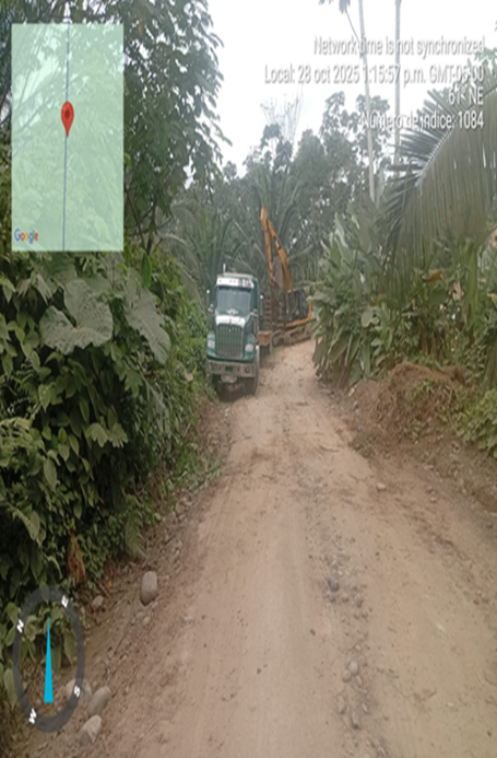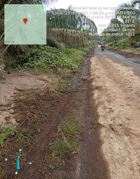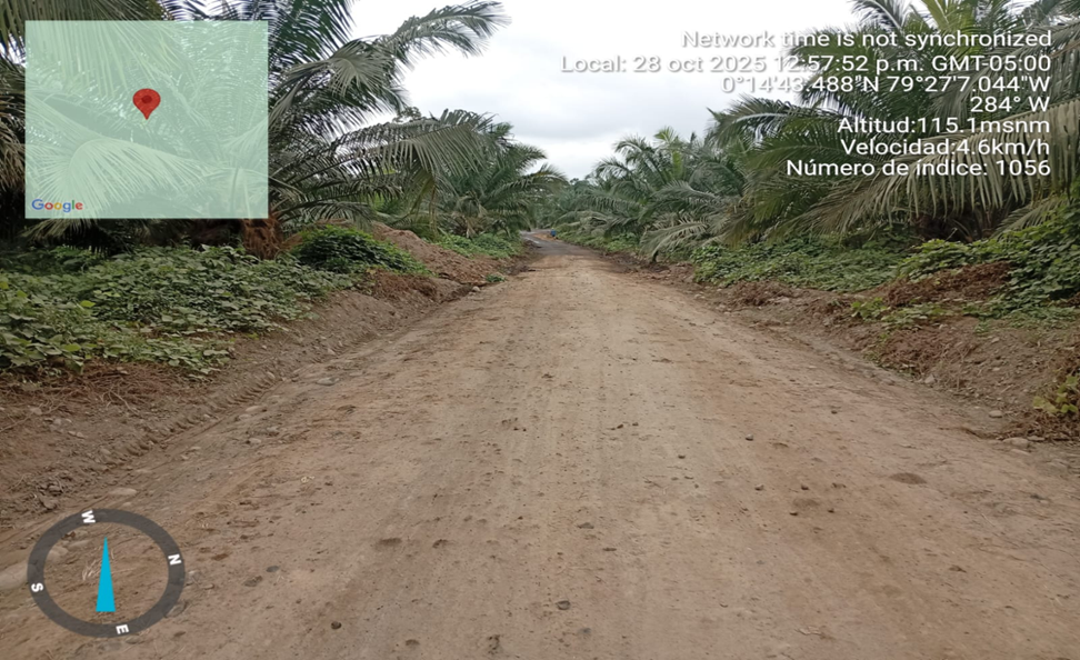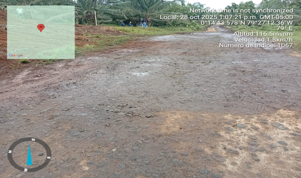 Vía de accceso de entrada al sector del derrame, no se conoce exactamente el nombre del sitio, solo se lo denomina Pueblo Nuevo, aquí en este sector se han construido barricadas para recoger el diesel derramado. A los lados las guardarayas existen cultivos de palma africana. El derrame ocurrió un poco mas arriba de Pueblo Nuevo.
