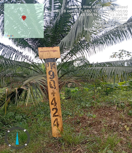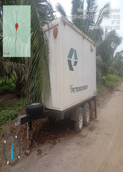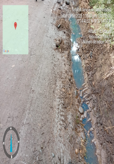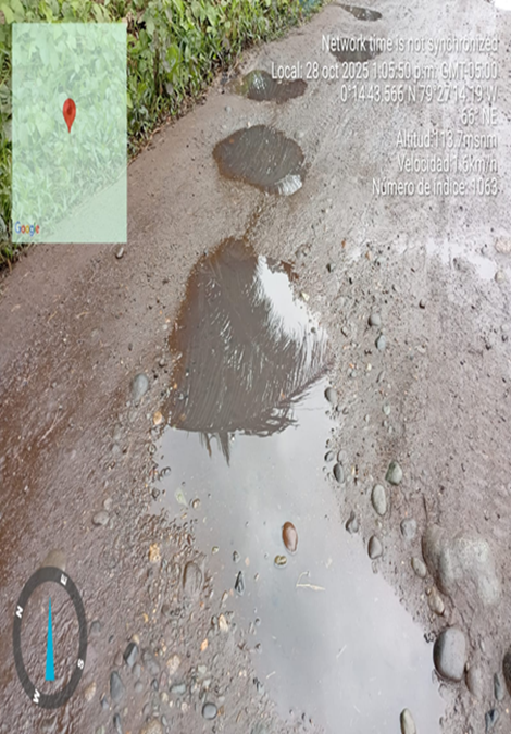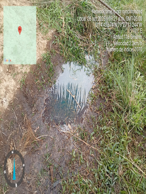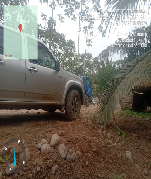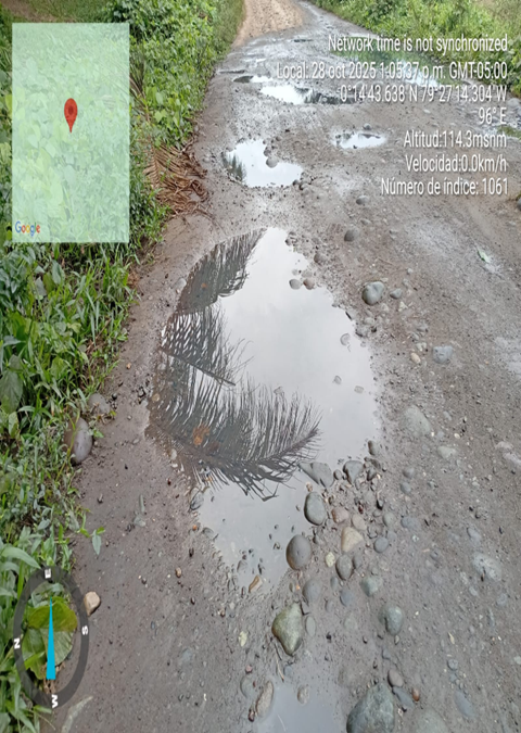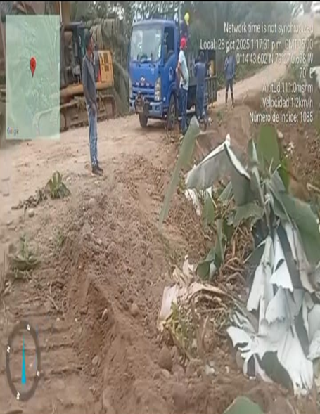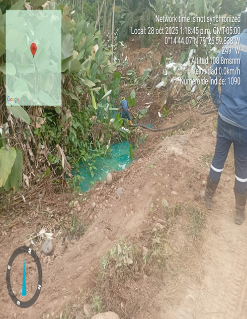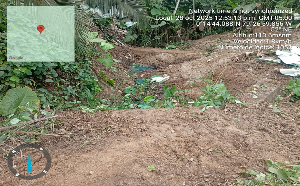 Vía de accceso de entrada al sector del derrame, no se conoce exactamente el nombre del sitio, solo se lo denomina Pueblo Nuevo, aquí en este sector se han construido barricadas para recoger el diesel derramado. A los lados las guardarayas existen cultivos de palma africana. El derrame ocurrió un poco mas arriba de Pueblo Nuevo.